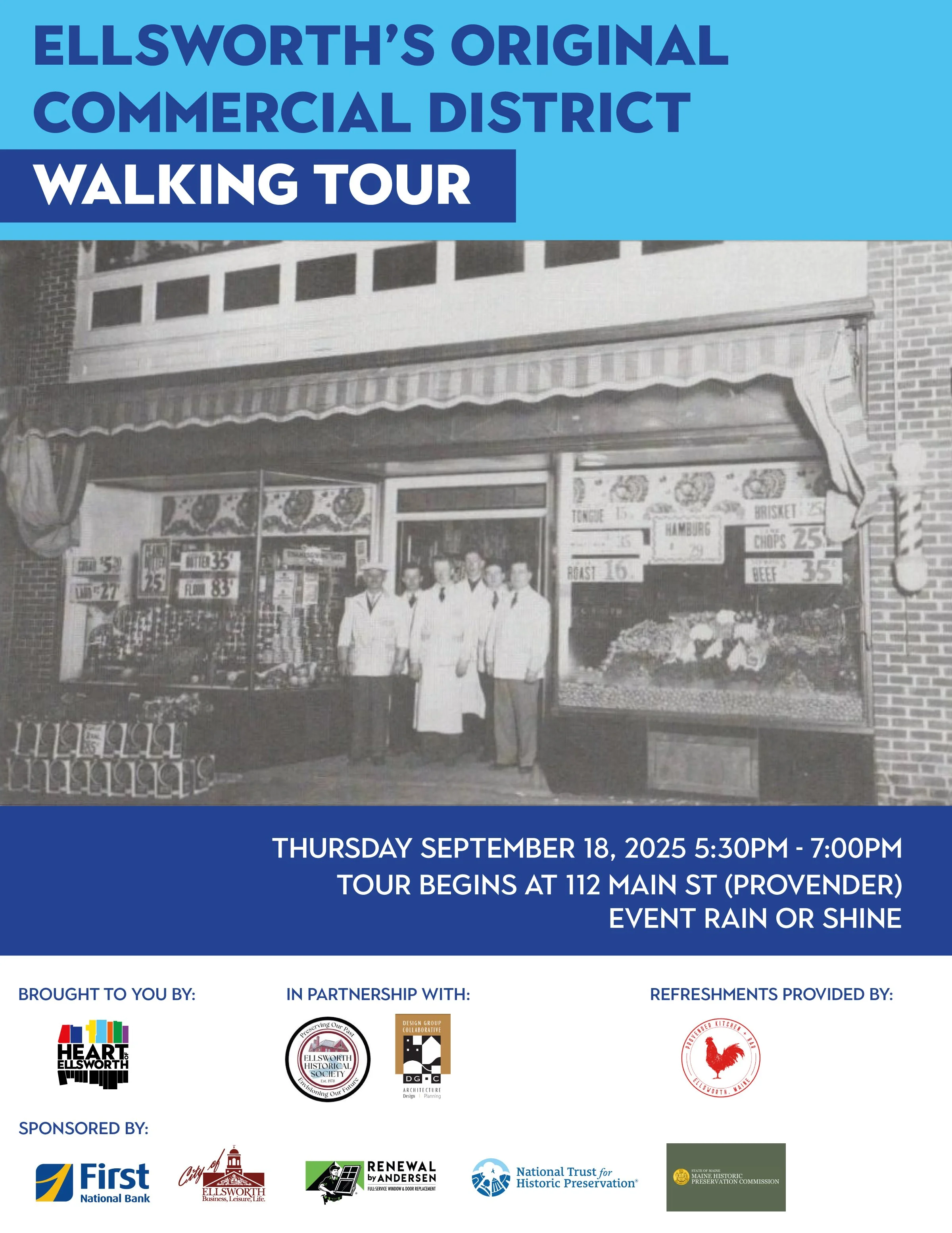 Heart of Ellsworth is hosting a historic walking tour of Ellsworth’s original commercial district. The tour is sponsored by First National Bank, The City of Ellsworth, Renewal by Anderson, the National Trust for Historic Preservation, and the Maine Historic Preservation Commission, in partnership with the Ellsworth Historical Society and Design Group Collaborative.