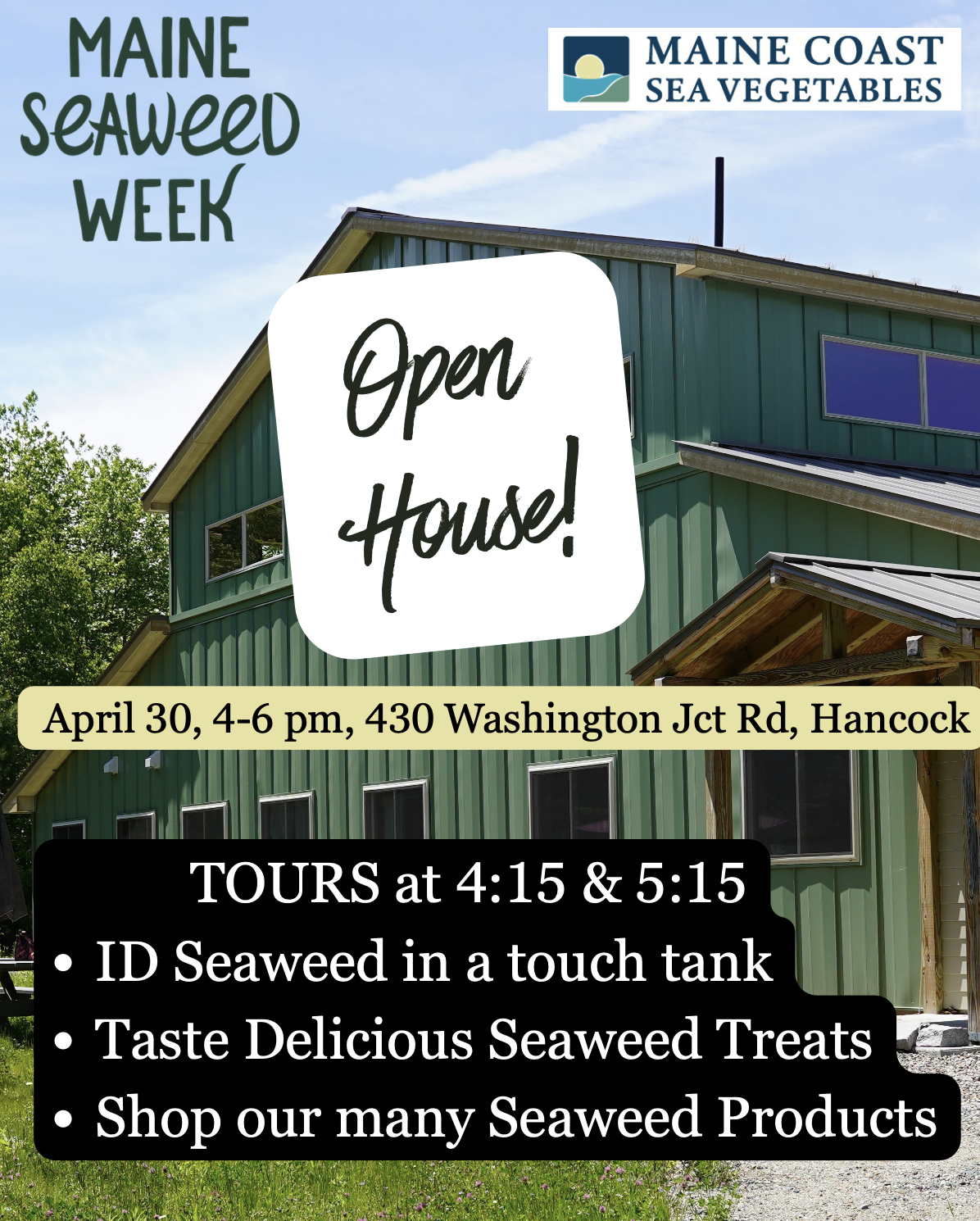 Our partners at Maine Coast Sea Vegetables are opening their doors Thursday night of Maine Seaweed Week for a special behind the scenes experience featuring tours, tastings, hands on exploration, and shopping.