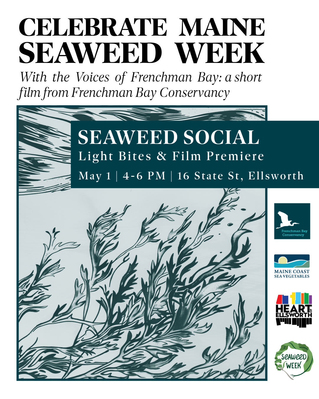 Join Frenchman Bay Conservancy, Maine Coast Sea Vegetable, and Heart of Ellsworth for a Seaweed Social at the Makerspace! Stop by to learn all about Downeast Maine’s seaweed harvesting industry through seaweed-themed small bites, activities, and a short film screening.
