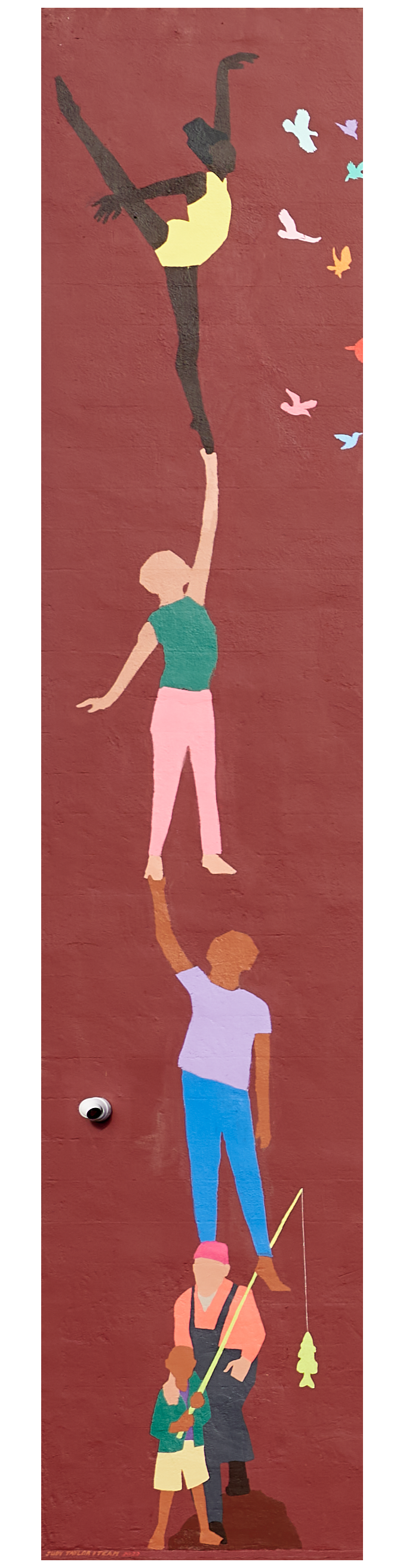 This tower represents community building and renewal with people standing on the shoulders of other people. It’s also a design element up the side of the wall allowing confetti of birds and fishes to create a pattern of design that extends the entire length of the wall and swoops back up. Local art teacher Sara McDougall led nine area high school students on a month-long student program to learn the history of mural painting, the process of designing a mural, and the materials and techniques involved with painting a mural. The students learned about the variety of birds and fish that are native to the Ellsworth region and created bold, stylized drawings that were turned into stencils and later applied to the mural, with artist supervision.